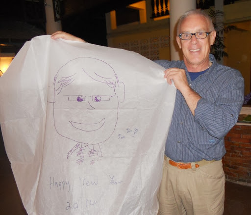 I drifted back to the stage area, listened to some prize giveaways in Thai for a little while, listened to another band, and by 9:30 or 10:00 was getting pretty tired, so I started walking back to 3-Sis. When I walked into the lobby, the staff had a lantern on the front desk, and were drawing their names and sayings on it. They asked me to add my name, and we stepped outside to the open field next door and lit and launched the lantern. When we came back in, Poppy (the owner of 3-Sis) had drawn a caricature of me on another lantern: