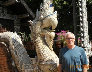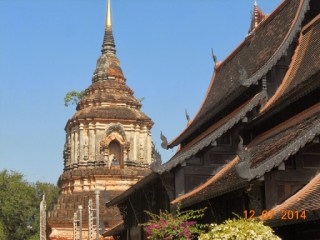 Here is a view with the large chedi at the back of the teak worship hall. This is much larger than most, but not nearly as large at the old chedi at Wat Chedi Luang, across the street from 3-Sis.