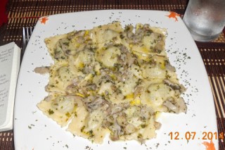 Then I had the “ravioli di magro con man dorle pinoli e uvetta,” or ravioli stuffed with pine nuts and raisin ricotta cheese and almonds with a parmesan cheese/mushroom white wine sauce.
