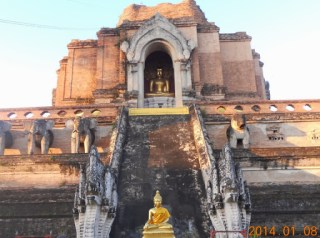 I walk around Wat Chedi Luan every day at least once, one of my many favorite places. Translated to English, “wat” means temple grounds, “chedi” means pagoda or stupa (a stupa is a burial mound or pagoda), and “luang” means really big. So Wat Chedi Luang is the temple with the really big pagoda. And the chedi IS very big. The chedi was originally built in the late 13th century, and the large chedi first completed in the mid-1400s at a height of about 82 meters (270 feet) high, the largest structure in all of Lanna (the country making up most of northern Thailand and Laos). Sometime after its discovery in Chiang Rai, the Emerald Buddha was installed here at Wat Chedi Luang. In 1545, an earthquake destroyed the top of the large chedi, and some of the elephant statues along the sides. Later the Emerald Buddha was moved to Laos, back to Chiang Rai, to Ayutthaya, and now it resides at Wat Phra Kaew in Bangkok by the Grand Palace.