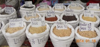 On the walk back from Wat Phra singh to the Tamarind Village (Linda’s hotel), we passed a local market. I noticed 15 different types of rice for sale. And this is just a small, local market catering to the neighborhood people. We typically believe that all Asians eat mostly white rice, but here they do eat a variety – that is evident in the restaurants, some have several from which to choose..