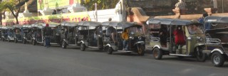 A tuk-tuk is a three-wheeled, three-person vehicle powered by a motorcycle engine that in Thailand, uses natural gas as fuel. Tuk-tuks evolved from rickshaws, and are used in many countries for various types of transportation. In Thailand, they are used heavily for short-ride taxis in Bangkok, Chiang Mai, Chiang Rai, and Pukket (the major tourist cities). There are no meters, the fare is negotiated in advance for the destination. Unfortunately, many of the tuk-tuk drivers are aggressive drivers, and tend to charge tourists too much, so I avoid them. Sometimes they are the best option available, as the shared ride Red Trucks do not go everywhere.