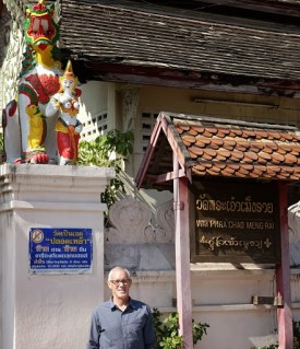 I continued to Wat Meng Rai, named after King Mengrai, This is not a terribly old or special temple, but I love the artistry of the thewada (angelic beings that live in the heavenly realms) on the old viharn (worship hall). A couple from England took the picture of me squinting in the bright sun.