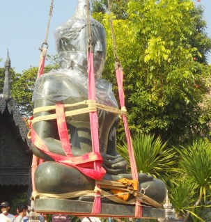 The two new Buddha statues to be moved into place today are each made from a single piece of stone quarried from the bank of a river up near Chiang Rai (100 miles north of Chiang Mai). The larger of the two is said to be over 8500 kg, about 18,000 pounds or 9 tons.