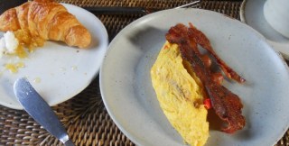 Then I returned for a couple small croissants, a small omelette, and some bacon. It is a very western breakfast, but very tasty. By the croissant is a dollop of fresh pineapple jam and another of fresh coconut jam that they make daily at the Tamarind Village. I need not say that they both are a treat.