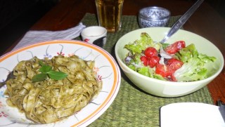 I was hoping that the rain would let up, as the Green Papaya Sangha meditation group meets on Thusday nights at the Yoga Tree, about 1 and 1/2 kilometer walk from the 3-Sis. By about 4:30 PM, the rain had stopped, so I went down to Jane’s Kitchen for some dinner. Jane’s closes at 6, and I got there by 5 and was the only customer. Jane and I chatted. She is Thai, but sounds very American. I learned that the first part of her life was in Chiang Mai, and then when she was 12, her family moved first to Southern Illinois, and then to New York City. After college in the U.S. they returned to Thailand, first to Bangkok, and now back in Chiang Mai. Jane sounds American — her speech sounds like someone who had always lived in the U.S. When she speaks Thai, she sounds like a native Thai (which she is). Jane’s Kitchen is small, and they are an organic, vegetarian restaurant, using local organic produce. she also makes her own pasta and all pasta sauces and salad dressing.