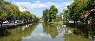 Looking north from Tha Phae Gate along the moat up to Si Phum Corner. From this far away, Si Phum corner is not yet visible. And for a long stretch here, there is no wall along the moat.