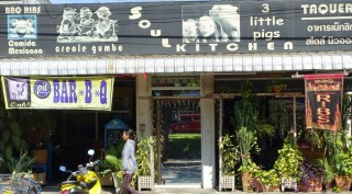 About in the middle of the north side of the wall/moat on the outside perimeter road is something of a surprise, the 3 Little Pigs Soul Kitchen. In Chiang Mai. Serving BBQ ribs, creole, and gumbo. Chiang Mai is definitely international!