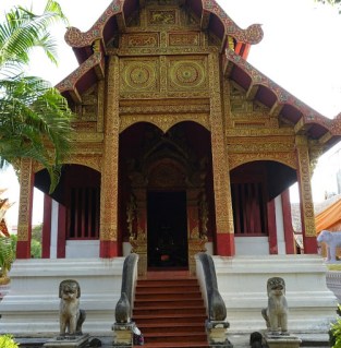 After visiting Nimmanhaemin Road, on my walk back to 3-Sis, I stopped again at Wat Phra Singh. It was suggested that I take a look at the old, smaller viharn (worship hall) in the back and view the old paintings on the inside walls. There are always crowds at Wat Phra Singh, just like at Wat Chedi Luang. I made my way past the large viharn, back by the large chedi where there two smaller and definitely older viharn.