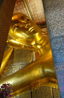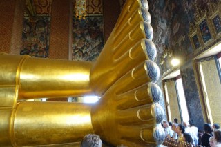 Back across the river on the ferry for 9 THB (25 cents), and following the crowds to Wat Pho to see the Reclining Buddha. Wat Pho, or more formally, Wat Phra Chetuphon Vimolmangklararm Rajwaramahaviharn, is the first in the list of six temples in Thailand classed as the highest grade of the first class Royal temples. the shorter name, Wat Pho is a contraction of its former name, Wat Photaram. Wat Pho is always busy, and in spite of the crowds, I love seeing the Reclining Buddha. And every time I have seen it, I am surprised at how large it is. I wrote in my notes that I would be surprised if it were less than 35 meters, and later I learned that it is 46 meters long. Because of the structure and the many people, it is difficult to get a good picture.
