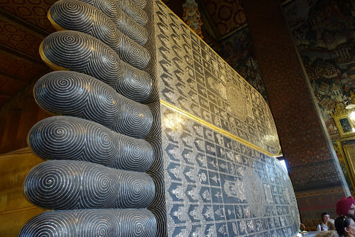The bottoms of the Reclinig Buddha’s feet with the Buddha special symbols, 4.5 meters long.