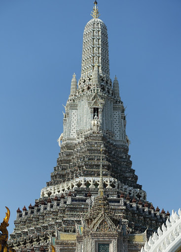 First view of the large tower, called a prang (a Khmer-style tower), surrounded by four, smaller, but equally impressive prangs. (It is not entirely clear if these are chedi or simply towers. My understanding is that a chedi holds the remains of someone of significance, and there is no indication that these towers hold remains, therefore that may be why they are not called chedi.) This is a very large structure, possibly up to 86 meters (282 feet) tall in some documentation; other documentation lists its height at 67 meters (220 feet). It is tall, and the detail in the decoration is clearly not meant to look old. The stairs are steep, and the public is not allowed up those stairs. Some detail of the tower in the next picture.