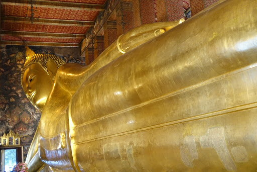 A view of most of the length of the Reclining Buddha body, most of the 46 meters.
