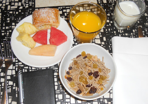 First, orange juice, cereal, fruit and a danish. The orange juice is very good in Thailand; the oranges are a little different than those we have in the U.S., smaller and with just a tang to the taste. Notice the raisins in the cereal, I am certain that those are available only because the hotel is catering to western palates; I do not think grapes are grown in large quantities in Thailand.
