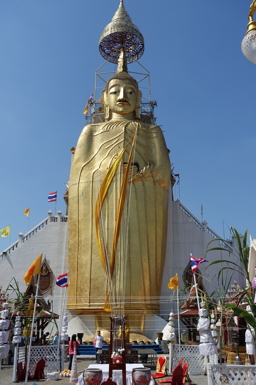 The most notable feature of Wat Inthara Wihan is the large standing Buddha statue. At 35 meters tall, is is large, but smaller than the Reclining Buddha at Wat Pho. The status is made of brick and stucco, and construction started in 1867 and took 60 years to complete, being completed in 1927. In 1982 during the 200th anniversary of the establishment of Bangkok as the new capital, the statue was refurbished and fitted with mosaic tile.