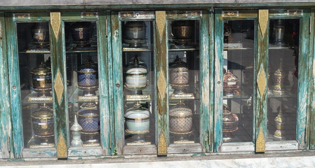 There were several cases of these rather ornate urns. All three urns in each column are identical except for the size, and each column is different. My guess is that these urns house ashes of passed loved ones. These are beautifully presented and there are about 6 or 8 of these cases at Wat Inthara Wihan.