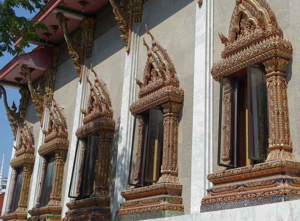 Ornate windows at the Wat Inthara Wihan main viharn (worship hall)