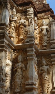 On the sides of the old viharn are thewada carved in stucco (thewada are “angelic beings that live in the heavenly realm,” or angels). These are some of my favorite thewada depictions, partly because I love the old carvings, and partly because of the artistry. Thewada have no gender, and depending on the design and the artist sometimes look very male, and sometimes very female.