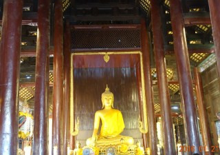 Inside the viharn, the rich teak continues; it is dark, rich, and beautiful.