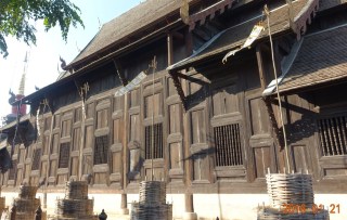 Right next to Wat Chedi Luang, and almost across the street from 3-Sis is Wat Pan Tao. Wat Pan Tao was built about the same time as Wat Chedi Luang, in the late fourteenth century. It was one of four monastic temples service the royal temple next door. The most interesting and obvious feature is the large teak viharn (worship hall). While not the original, this structure was formerly a royal residence, and became unused after the next king built his own new palace. The old palace buildings were often recycled into other uses, as was this – it was dismantled, moved, and reassembled as a new viharn at Wat Pan Tao in 1875.
