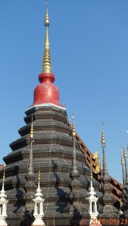 This is the largest chedi at the back of the teak viharn. A year ago it was covered in scaffolding and construction netting, and was apparently undergoing a restoration. The scaffolding is gone now, and this unusual pewter-colored chedi with a red top is the result. different and interesting.
