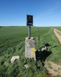 A way marker on the meseta. They are not all this good, and not all this new. This one is a combination of the old concrete way post with the shell backwards, a yellow arrow to clarify, and a newer sign with an arrow and a shell that I think should be rotated ninety degrees.
