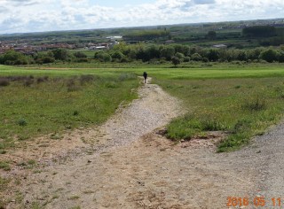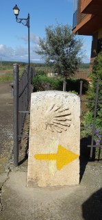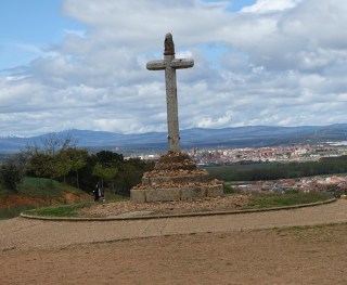 We are now t the point where the two paths rejoin. This is Cruceiro de Santo Toribio. a stone cross commemorating a 5th century Bishop Toribio of Astorga who fell to his knees here in a final farewell after having been banished from the town. There must be more of an interesting story about this, but I do not have time to find it right now. This is a wonderful view of the city of Astorgo. It seems so close, but we have at least 5 kilometers of walking to get there. In the distance, but not visible in the picture is snow on the mountains in the distance both ahead in this picture and also to the right, which is north.