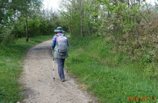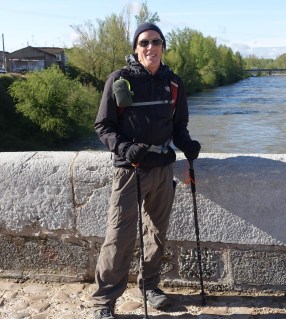 Here I am on the same bridge, a little more bundled up than Beth and Nancy. After crossing the bridge and walking through the village, we came to a path split point. One way went along highway N-120, a very busy highway, and the other went through the forest along a more natural path until the two paths met about 7 kilometers further at Cruceiro de Santo Toribio. Then there was one path to Astorga. Beth, being a faster walker, and having some foot problems, decided to take the highway route, as it was about 1.5 – 2 kilometers shorter, flatter, and a more consistent base. Nancy and I took the more natural route following this clearly marked arrow: