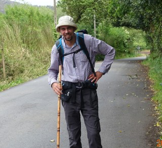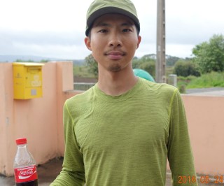 And here is Ben from Taiwan. We are waiting for the transport to our hotel which is several kilometers off the Camino, and Ben is seriously contemplating his post-walk Coca-Cola. (I also like a Coke after the walk, but I prefer to wait until after my shower and have the Coke cold with ice.)