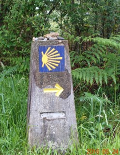 One of the Camino way markers along the path today. These markers have been very consistent since leaving Santiago de Compostela. Someone in this part of Galicia decided to be very consistent with the shell graphic on the Camino way marker monuments. When the convergence point of the lines are to represent Santiago de Compostela, then the direction to Finisterre is away from Santiago, and in the direction of the opening lines. These in this part of Galicia are very consistently made this way. And because of the consistency, when there is only a shell graphic without the arrow, we know which way to go.