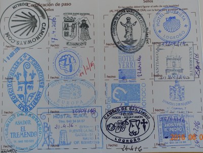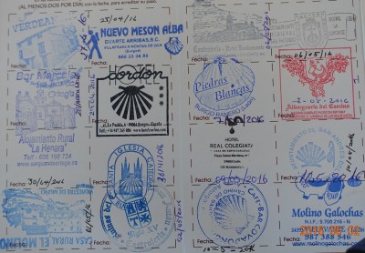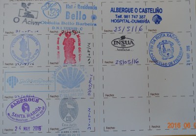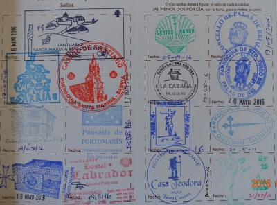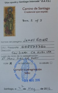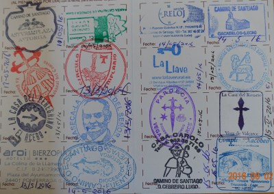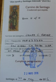 Before the journey home, here is my Pilgrim’s Credential with the stamps I accumulated along the way. The first credential filled and got a second credential. This is also called the pilgrim’s passport. The first two photos are the first pages of the two credentials. both having been stamped at the pilgrim’s office at the cathedral in Santiago. The stamps read Oficina Del Peregrino S.A.M.I Catedral – Santiago which loosely translates to the Pilgrims Office at the S.A.M.I. Cathedral in Santiago. S.A.M.I. is acronym for the Holy Apostolic and Metropolitan Church in Santiago de Compostela.