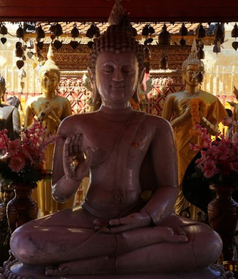 This Buddha icon is a rose-colored stone. I do not know the story, but I do not remember seeing this one in past visits to this temple.