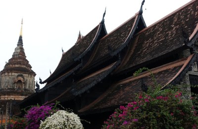| View of Wat Lok Molee showing the distinctive Lanna-style viharn roofline with the large chedi in the background. |