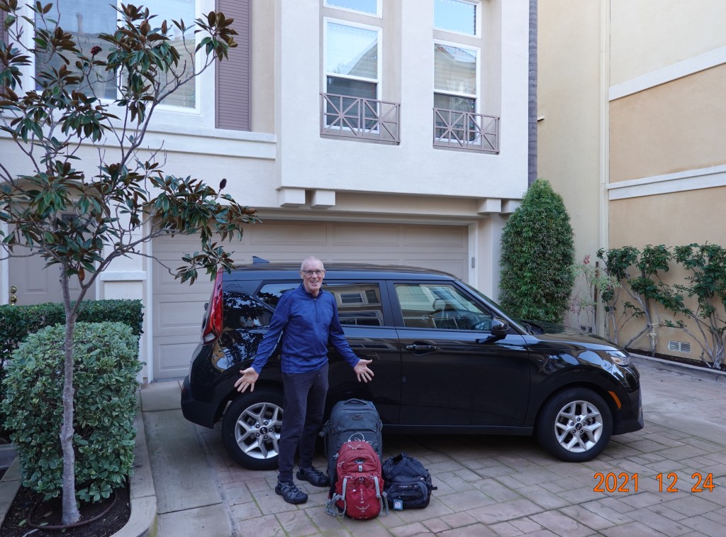 Fortunately the heavy rain and wind that came overnight tapered off during Christmas Eve morning, so I walked to the Avis location and got a car. A nice little Kia Soul. Here I am in front of my house about to load up my luggage as I am in the final preparations for the month-long trip.