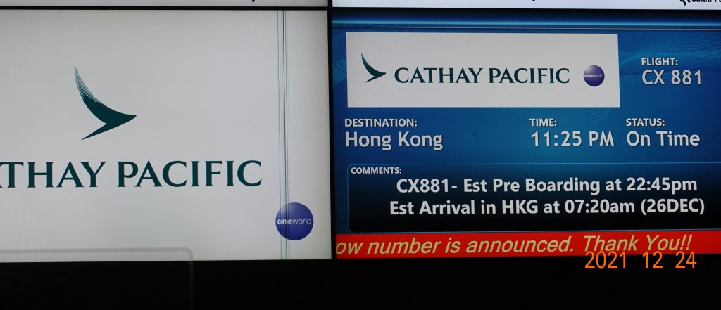 The boarding process was fast as there are fewer travelers now. Tourism is down dramatically all over. The last two times I flew on these same flights pre-pandemic, they were full, every seat taken. On this flight, I was in a cabin of 5 rows and 36 total seats of which exactly 3 were occupied. The flight itself was relatively uneventful, but there was moderate turbulence much of the trip, so much so that the fasten seat-belt sign was lit for at least the first 10 or 11 hours. And that made it difficult to sleep, but I did manage to drift off for a few hours at least. Eventually we made it to Hong Kong, landing about 5-10 minutes early. Once inside the terminal, there was another round of documentation verification, then through international transfer security, and on to the gate.