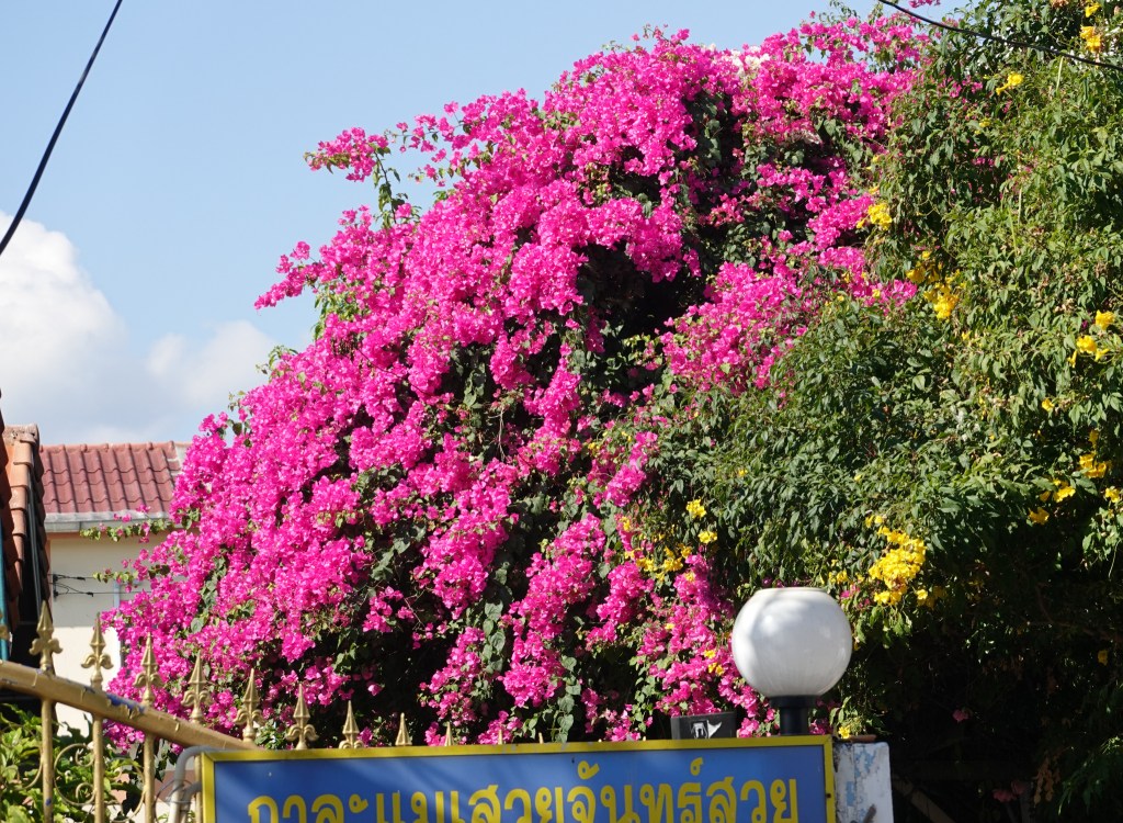 Just before I found the Khao Soi Lung Prakit Kaat Gorm, I saw this rather striking and large bougainvillea plant. These are common in Southern California, and also here in Chiang Mai. They are much like a poinsettia in that the color is not the flower, rather the leaves. There is a very small white flower surrounded by the colored leaves.