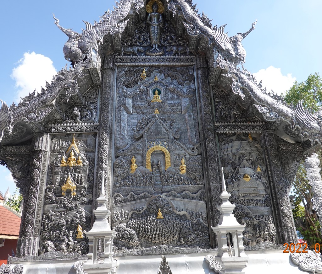 The craftsmen at Wat Sri Suphan work with nickel and aluminium for the ordination hall, although there is also some silver used in the construction of important images. The effect is certainly dazzling and unusual with a mass of repoussé and chased work, as well as carved figures, covering the exterior and interior and certainly makes for a great photographs.