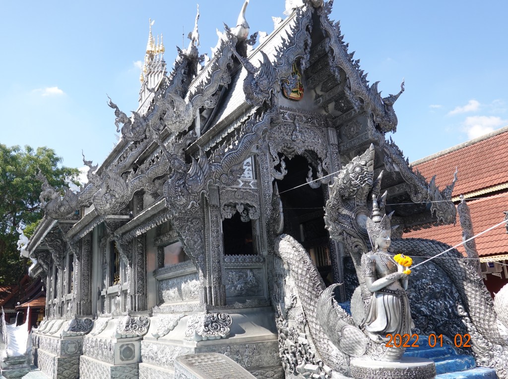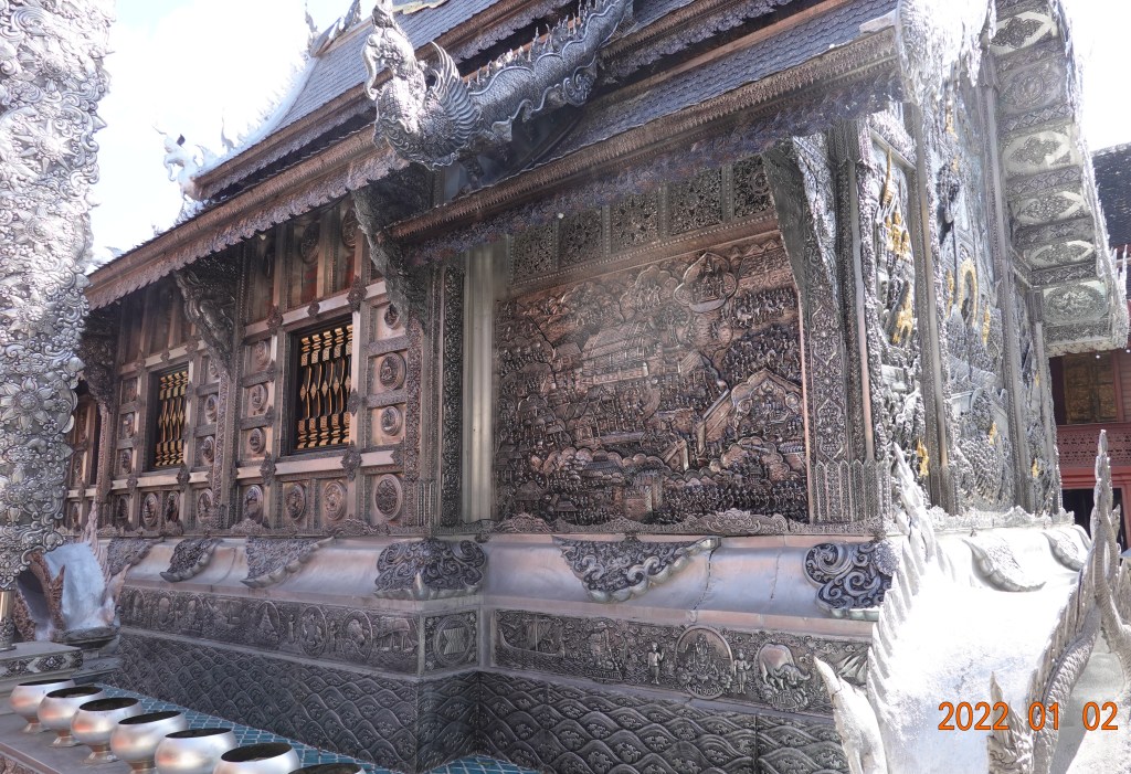 The most recent reincarnation of the temple began in 2004 under the direction of the abbot, Phra Kru Phithatsuthikhun. Instead of using standard temple renovation techniques, the abbot utilized the skill and knowledge of local silversmiths. The result is a building covered in silver metal which shimmers in the sunlight and is full of intricate details.