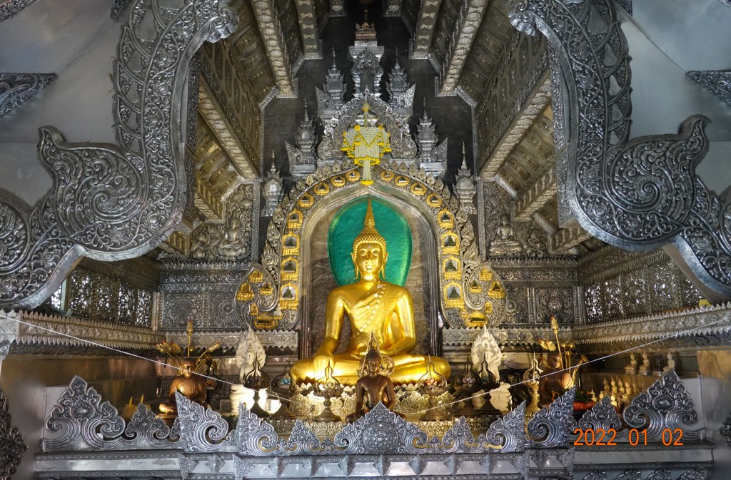 The entrance and inside the ubosot is more and more of the intricately hammered silver alloy. Inside, the Buddha image is in gold, contrasting with the silver all around.
