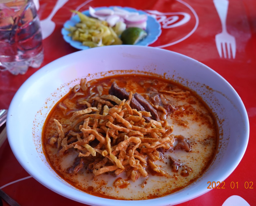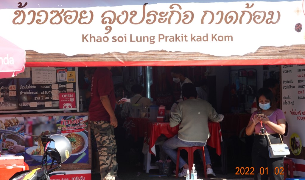 After breakfast, catching up on some work e-mail, and waiting eagerly for the results of my PCR test yesterday, I decided to go out exploring to find the second khao soi restaurant south of the old city. I chose this one because it is open today – many places are closed for the entire New Year’s weekend. The place is Khao Soi Lung Prakit Kaat Gorm, located directly south of Chiang Mai Gate on Suriyawang Road.