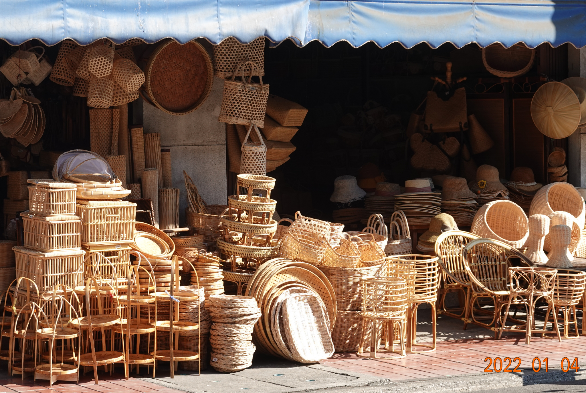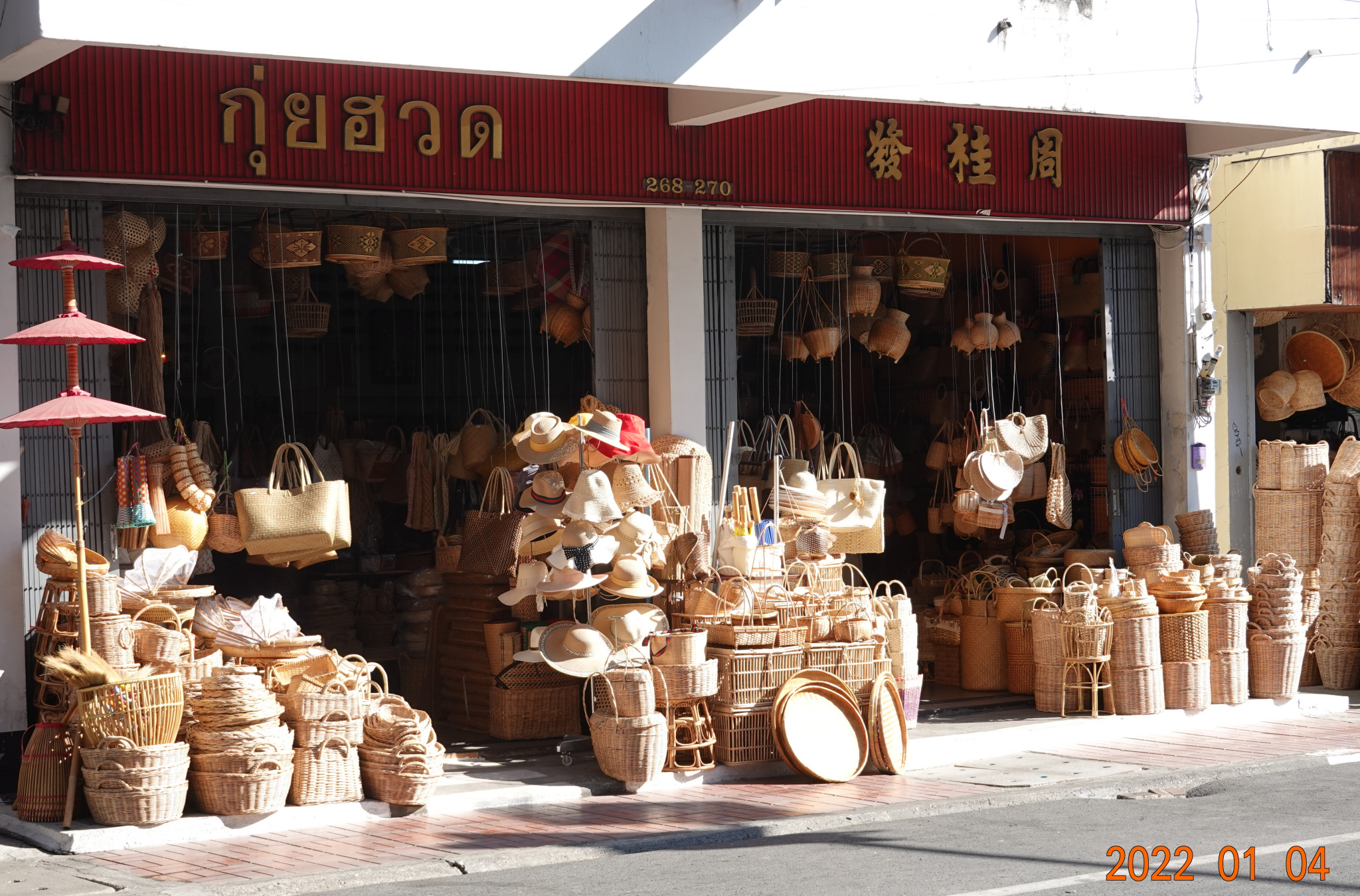 Chiang Moi Road is a one-way road outbound from close to the middle of the east side of the wall/moat to the Mae Ping River. Not too far, about 1.5 kilometers. Tha Phae Road is one-way inbound from the Mae Ping River and the Nawarat Bridge to Tha Phae Gate at approximately the middle of the east side of the wall/moat. Chiang Moi Road is always busy and lined with interesting shops. The two wicker shops that in the 10 years of my visiting have always been here, side-by-side, are still here. If one wants anything wicker, it can be found here: