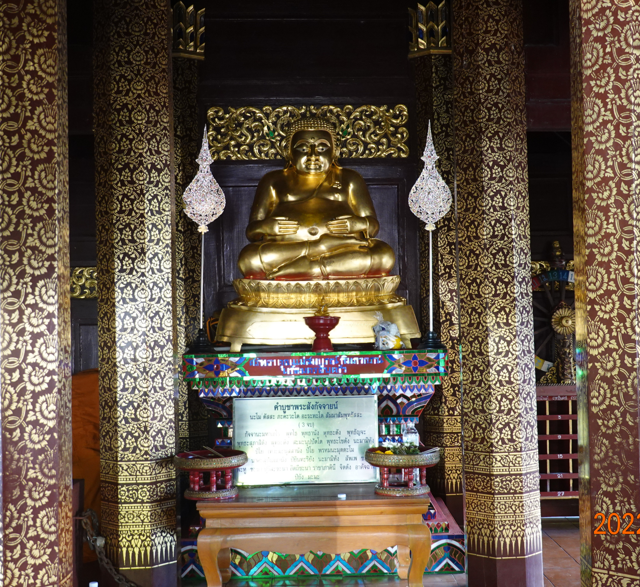 The name Wat Kate Karam has one of the sounds that does not translate easily from Thai to English. On the temple grounds, I see three different English spellings: Ket, Kate, and Gate. The sound is really in between the hard K and G sounds in English, and leaves translators unsure how to spell the name. I see “Kate” or “Ket” most of the time. Wat Kate Karam is an older temple in Chiang Mai, first built in 1428. In 1545, the same earthquake that demolished the upper part of the chedi at Wat Chedi Luang also destroyed the chedi at Wat Kate Karam. The chedi was rebuilt and remains today.