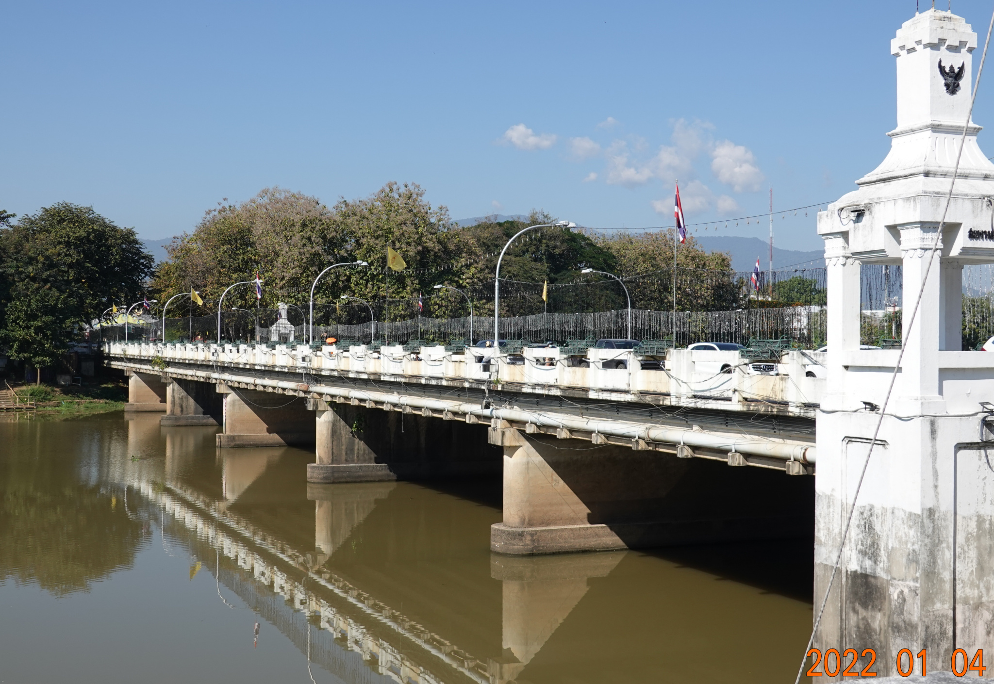 I walked south along the Charoen Rajd Road and had my choice of a couple of crossings to get back towards the old city and See You Soon. The first is the Nawarat Bridge, a very busy bridge, but with nice wide sidewalks. This is the most well-known and significant bridge of Chiang Mai, and has been reconstructed several times in history. In 1910, a wooden bridge with arch structure designed by an Italian was constructed using 600 teak logs. It was the first bridge over the Mae Ping River. A fire destroyed it, and in 1923 a replacement was built of steel. This one lasted for a time, but after deteriorating somewhat, was replaced with the current concrete structure in 1965. The bridge is often decorated with flowers along the sides. Now there are still holiday lights along the sides, not easy to see in the picture.