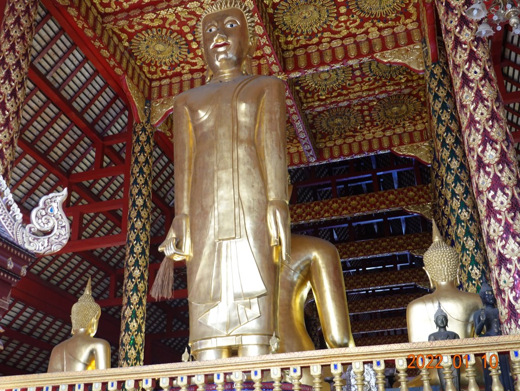 And around to the west or back of the viharn, there is this view of the large standing Buddha facing out to the large gold chedi: