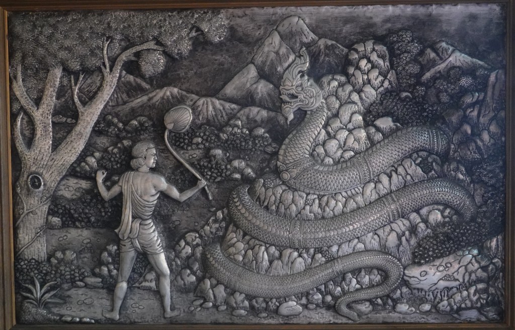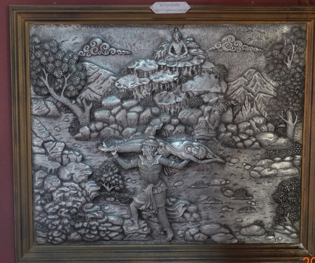 In many viharn, there are pictures inside on the sides depicting what seem to be significant events in history or of the Buddha’s life. Stepping into the viharn at Wat Sri Suphan, the sides have similar pictures, but rather than being painted, they are hand-hammered metal like that on the famous ubosot nearby. Here are two, and since there was no English translation, I can only guess at what is taking place.