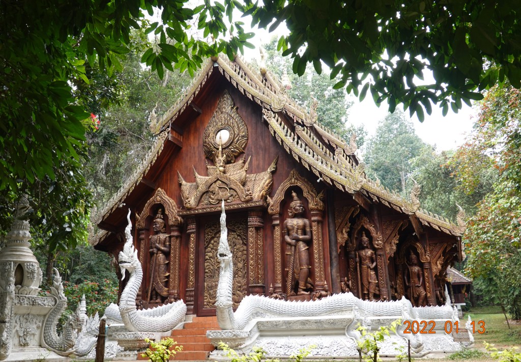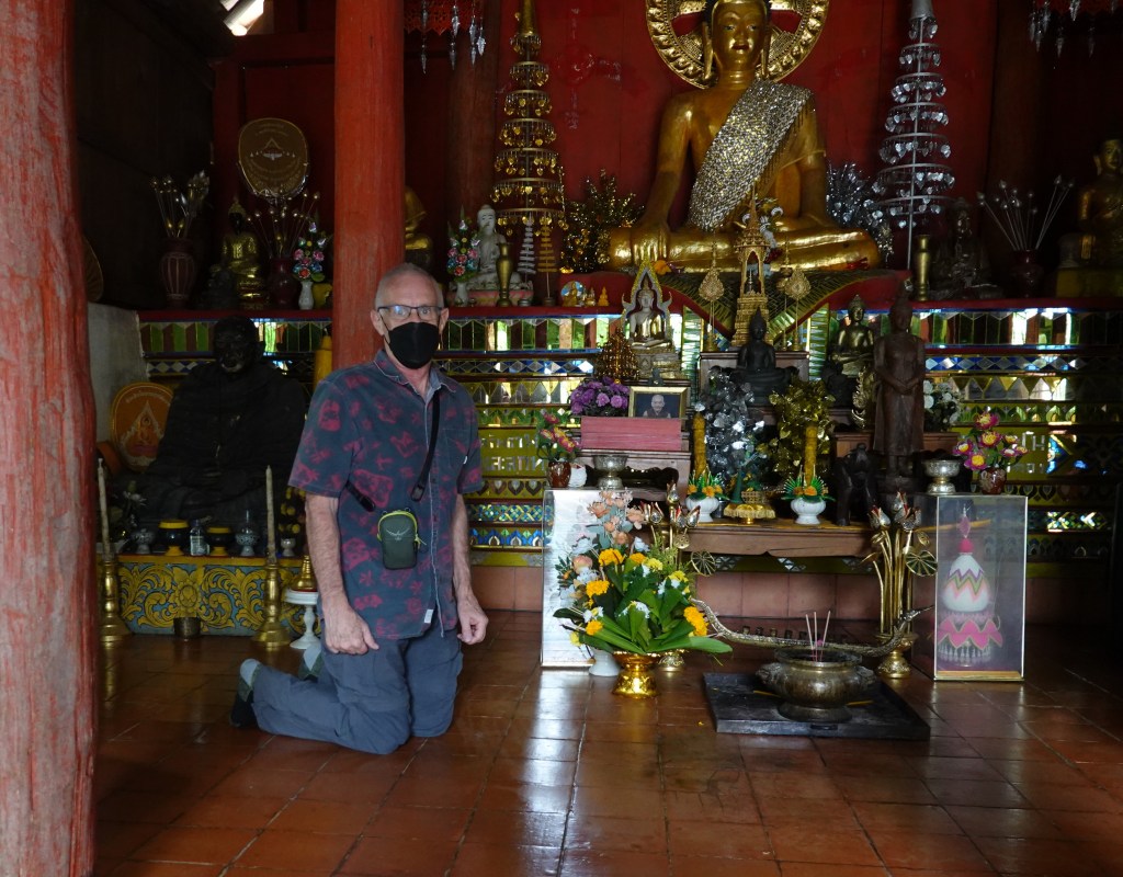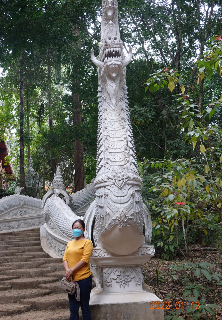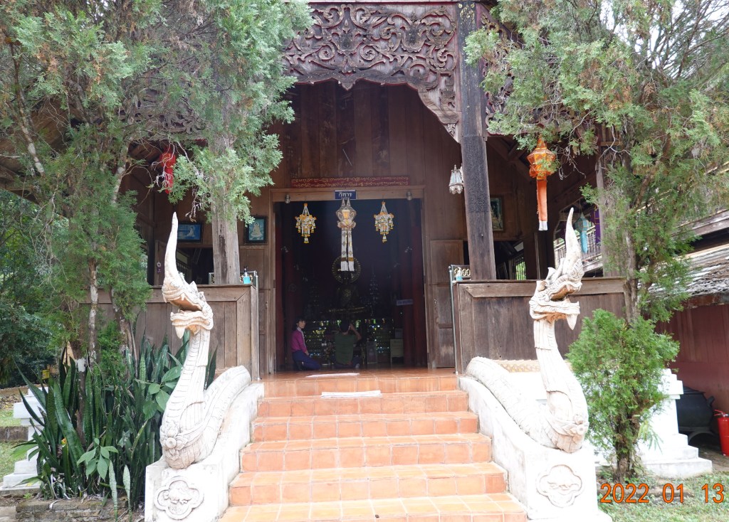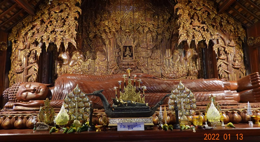 The Sunday Night Market is fun, although about the same every Sunday. The people attending are about half Thai and half tourists. There are many places to eat and socialize, and before the pandemic, this is what the Thai people did. There were also a good number of places where you could sit in a nice chair, put your feet up, and get a foot massage – one hour for 150 baht (about $5). My very first time at the Sunday Night Market, I sat down, and Nam was massaging the feet of a lady from Belgium in the chair next to me. The Belgian lady told me that Nam was the best and massaged her feet every week. I waited and Nam massaged my feet next. It is more than just the feet, really from the knees down, and most of the ladies doing the massages also know reflexology. After walking around all day, a foot massage in the evening is great just before turning in for the night. I enjoyed my foot massage with Nam, and the next Sunday, I found her again. Since that first Sunday, Nam has massaged my feet every Sunday at the Sunday Night Market, for the past eight years, except for last year when Thailand was closed to tourism. I have met her sister who also massages, her daughter and son-in-law, all very nice people. This year, because of the pandemic, Nam is not massaging on Sundays. She and her daughter have a copy and sign shop in Mae Wang where they live, about 40 kilometers (25 miles) south and slightly west of Chiang Mai. She invited me to join the the family as they were to visit to Wat Luang Khun Win in the mountains west of Mae Wang.