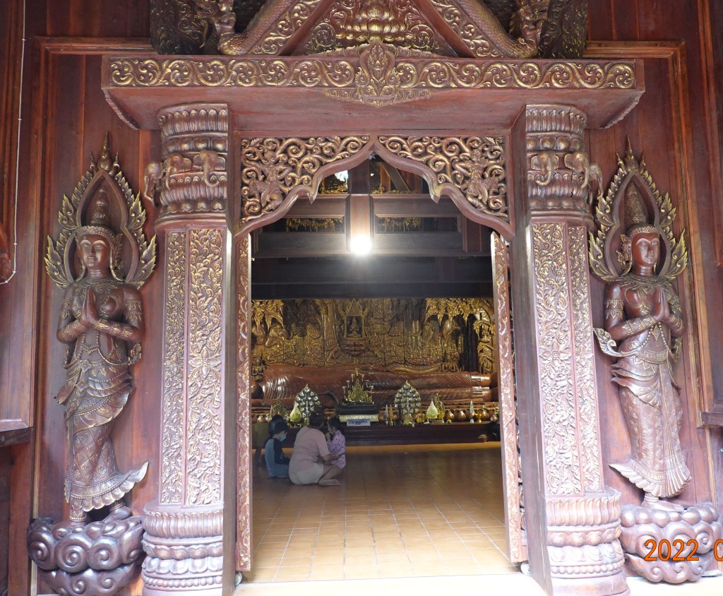 Inside is this reclining Buddha, about 7 meters long, carved from a single Champa tree that grows in the region: