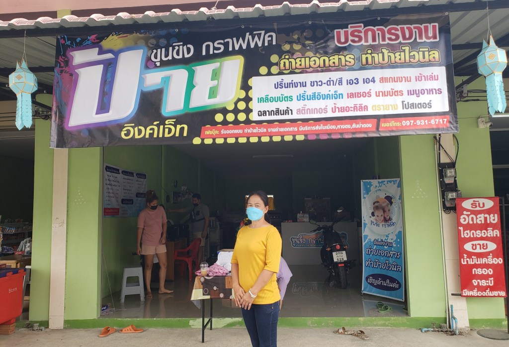 Nam and her son-in-law picked me up at See You Soon at noon. Nam does not drive a car, her son-on-law drove. We went to the copy & sign shop down near Mae Wang, and I got to see the shop. Here is a picture of Nam outside the shop: