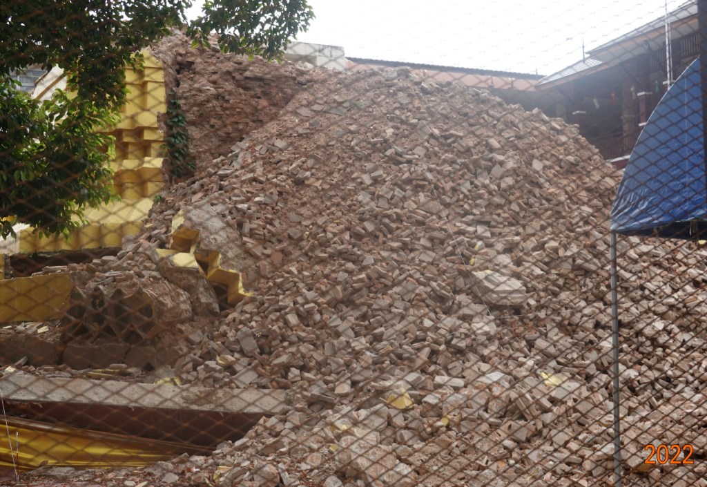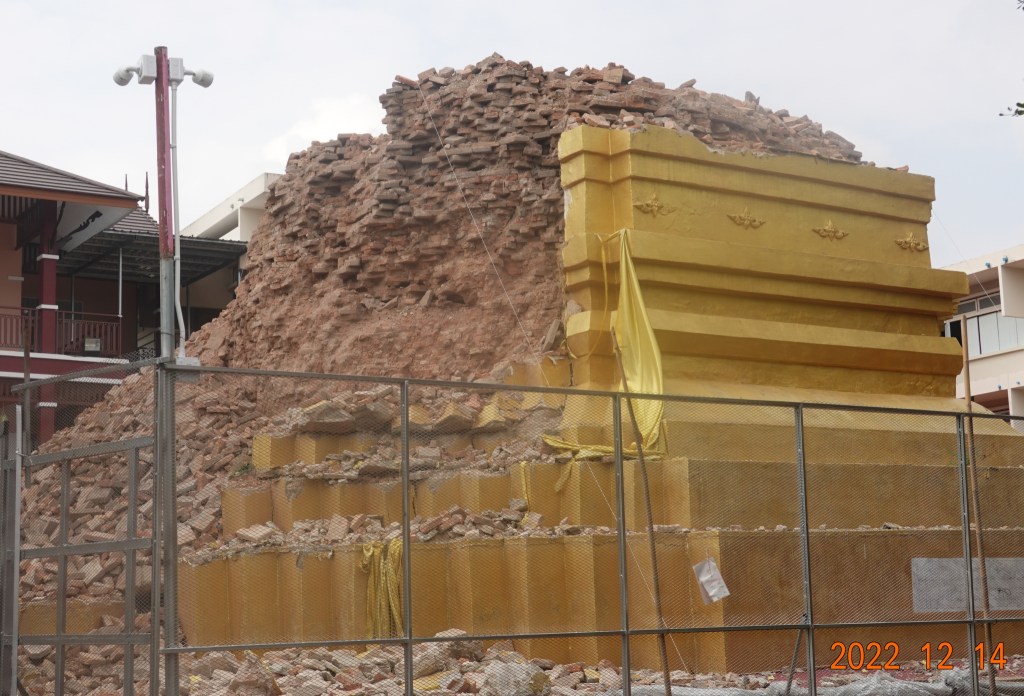 Not much cleanup has been done except fencing off the area. And it is unclear if a new chedi will be built. I suspect so, the question is when. A chedi is a very sacred structure, so there are likely many rituals that must be followed throughout the cleanup and rebuild process. Here is a view from the other side through the fence. It basically looks like a large pile of bricks.