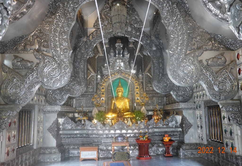 Inside the Silver Ubosot, a very “silver” place with the striking gold Buddha statue: